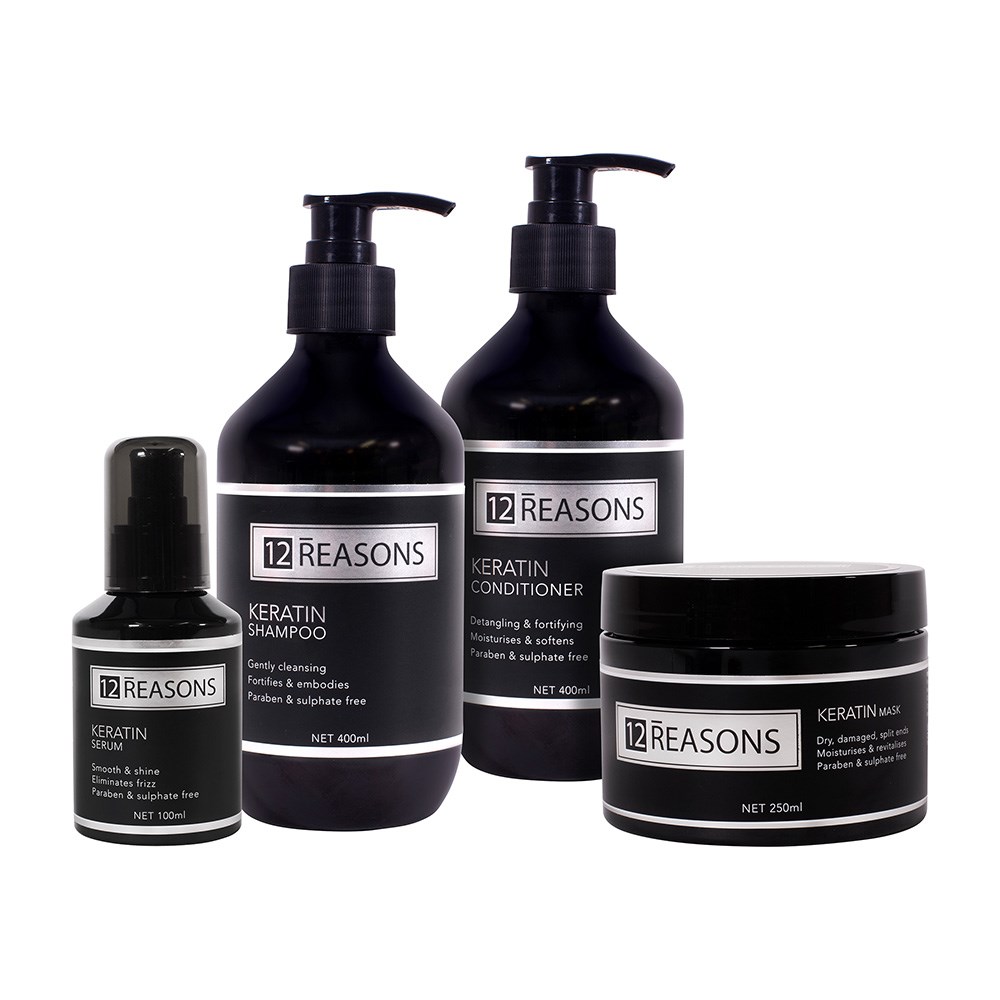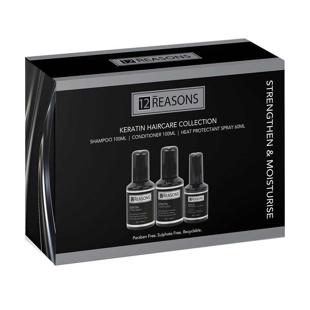 Love travel with 12Reasons! 12Reasons Keratin Travel Pack makes travel beautiful with three travel-sized products. Restore strength and shine while adding softness. Hair is left fortified and repaired. Dry, damaged hair is transformed, shining with nourishment. Enriched with keratin, macadamia oil and avocado oil for the best of nature. Free from parabens and sulphates. Colour-safe. Vegan. Not tested on animals. Designed and formulated in Australia.