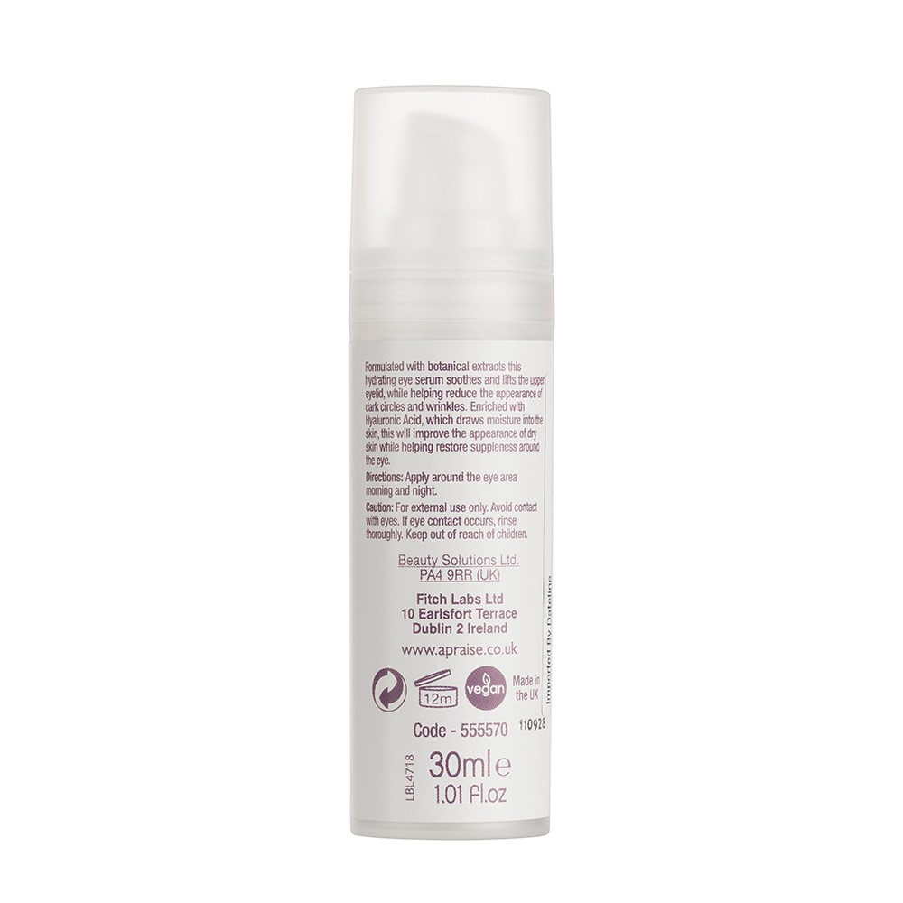 Formulated with botanical extracts, Apraise Eye Serum is a hydrating eye serum which helps soothe and strengthen the skin of the upper eyelid, while reducing the appearance of dark circles and wrinkles. Enriched with hyaluronic acid to draw moisture into the skin, this serum will improve the appearance of dry skin while restoring suppleness around the eye. Suitable for sensitive eyes.