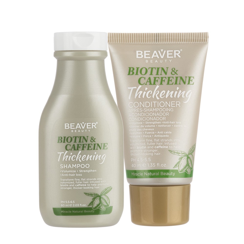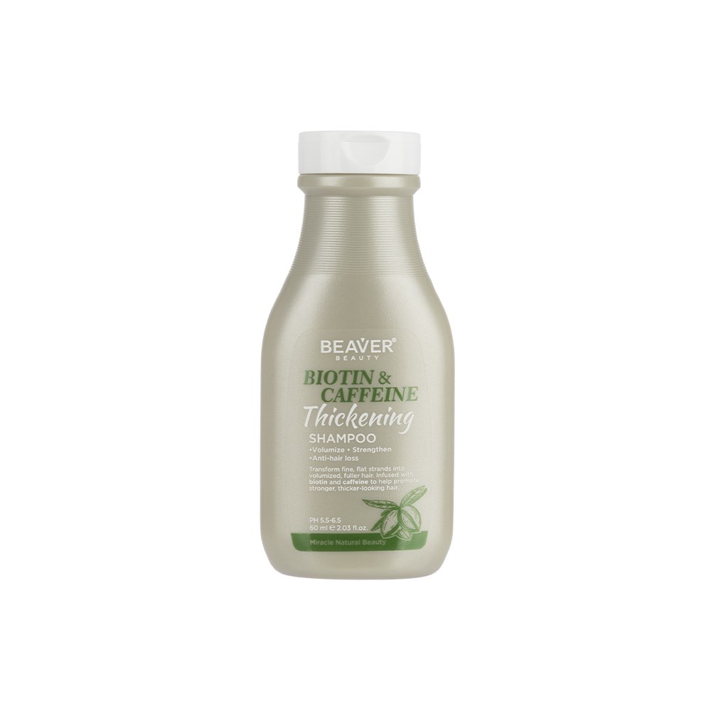 Help transform fine, lifeless strands into volumised, thicker-looking hair. Beaver Biotin and Caffeine Thickening Shampoo 60ml is an anti-breakage formula which strengthens and fortifies. Infused with biotin and caffeine, hair is left nourished, stronger and more resilient. Gently cleanses while promoting volume and helping to prevent breakage. Free from sulphates and parabens. Colour-protective formula.
