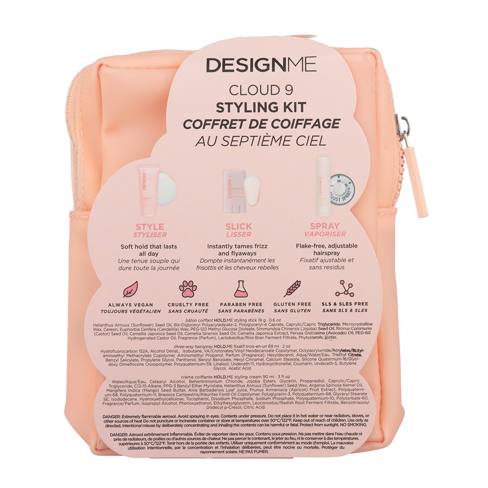 Turn heads with this limited edition kit. DESIGNME Cloud 9 Styling Kit gives you the versatility to style your strands for any occasion. From sleek buns to soft waves, this kit is every reason to celebrate in style. Full-size Hold.ME Styling Stick for sleek looks. Hold.ME Styling Cream for salon-level blow-dries with shine. Hold.ME 3 Way Hairspray with adjustable hold to lock in your style just the way you like it. Release your inner stylist! Vegan, cruelty-free, gluten-free, paraben-free and SLS/SLES-free.