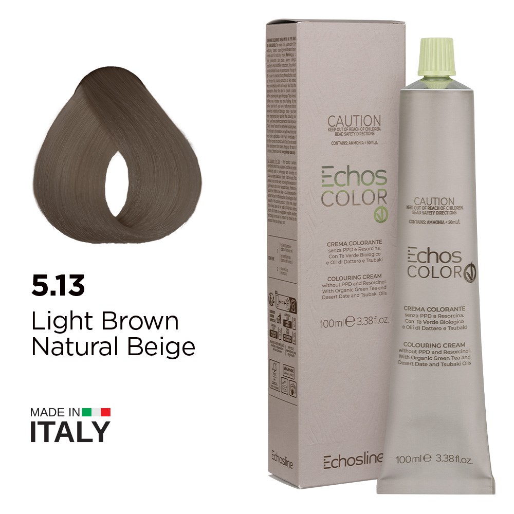 Incredible depth and longevity with reduced impact. Echos Color Vegan Hair Colour 5.13 Light Brown Natural Beige respects professionals, consumers and the environment. This 100% vegan colouring cream is formulated without paraphenylenediamine (PPD) and resorcinol. Rich, long-lasting permanent hair colour boosted by green tea extract for longevity, desert date oil for revitalisation and tsubaki oil for shine. Made in Italy, this is elite hair colour turned vegan.