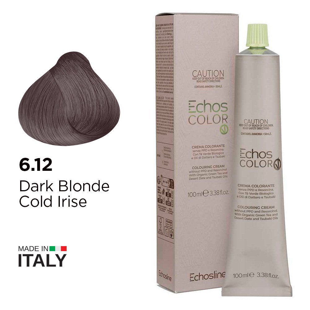 Incredible depth and longevity with reduced impact. Echos Color Vegan Hair Colour 6.12 Dark Blonde Cold Irise respects professionals, consumers and the environment. This 100% vegan colouring cream is formulated without paraphenylenediamine (PPD) and resorcinol. Rich, long-lasting permanent hair colour boosted by green tea extract for longevity, desert date oil for revitalisation and Tsubaki oil for shine. Made in Italy, this is elite hair colour turned vegan.