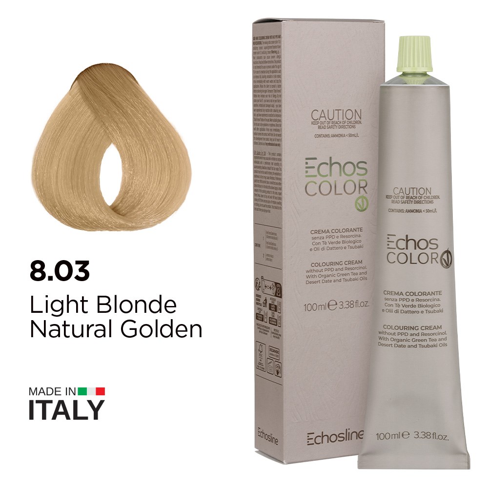 Incredible depth and longevity with reduced impact. Echos Color Vegan Hair Colour 8.03 Light Blonde Natural Golden respects professionals, consumers and the environment. This 100% vegan colouring cream is formulated without paraphenylenediamine (PPD) and resorcinol. Rich, long-lasting permanent hair colour boosted by green tea extract for longevity, desert date oil for revitalisation and tsubaki oil for shine. Made in Italy, this is elite hair colour turned vegan.