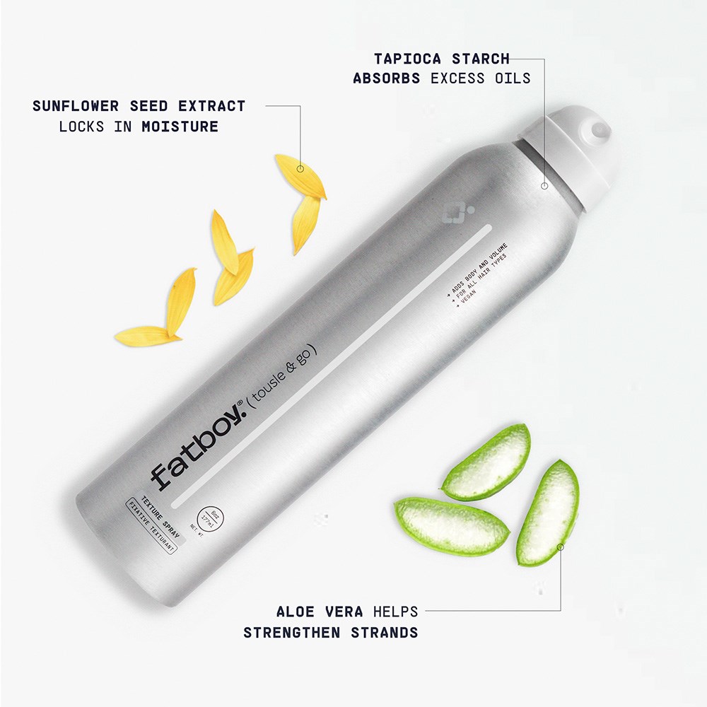 Spray, tousle and go. It’s as simple as that with Fatboy Tousle & Go Texture Spray. This versatile styling spray has been specifically formulated to add volume, definition and workable hold to all hair types. Designed to add hold and tame flyaways with a light flexible finish without the crunchiness. The perfect blend of light hold texturising spray and dry shampoo makes this a hair must-have styling spray for fine hair. Get ready to top the charts with stylist-grounded, performance-driven Fatboy.