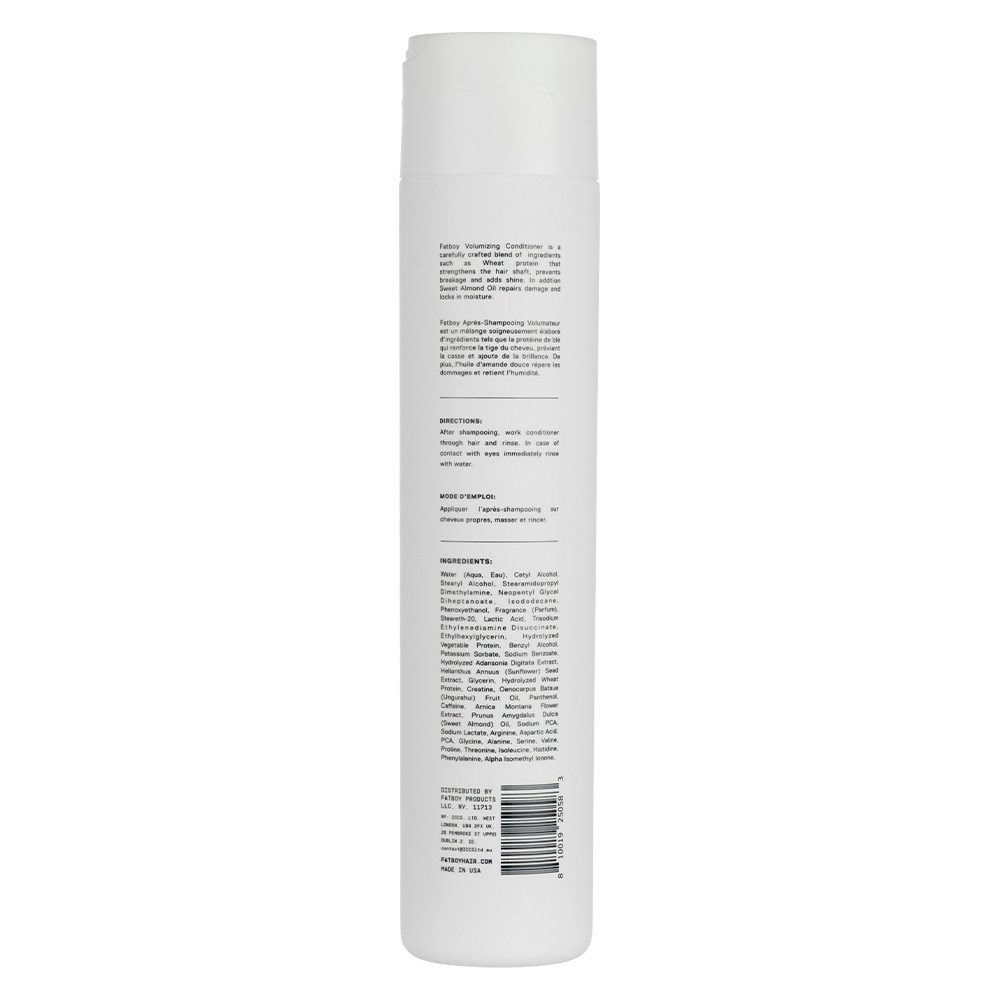 Fatboy Volumising Conditioner is a carefully crafted blend of select ingredients. Wheat protein strengthens the hair shaft, preventing breakage and adding shine. In addition, sweet almond oil repairs damage and locks in moisture. Hair shines with every use. Paraben-free, sulphate-free and cruelty-free. Get ready to top the charts with stylist-grounded, performance-driven Fatboy.
