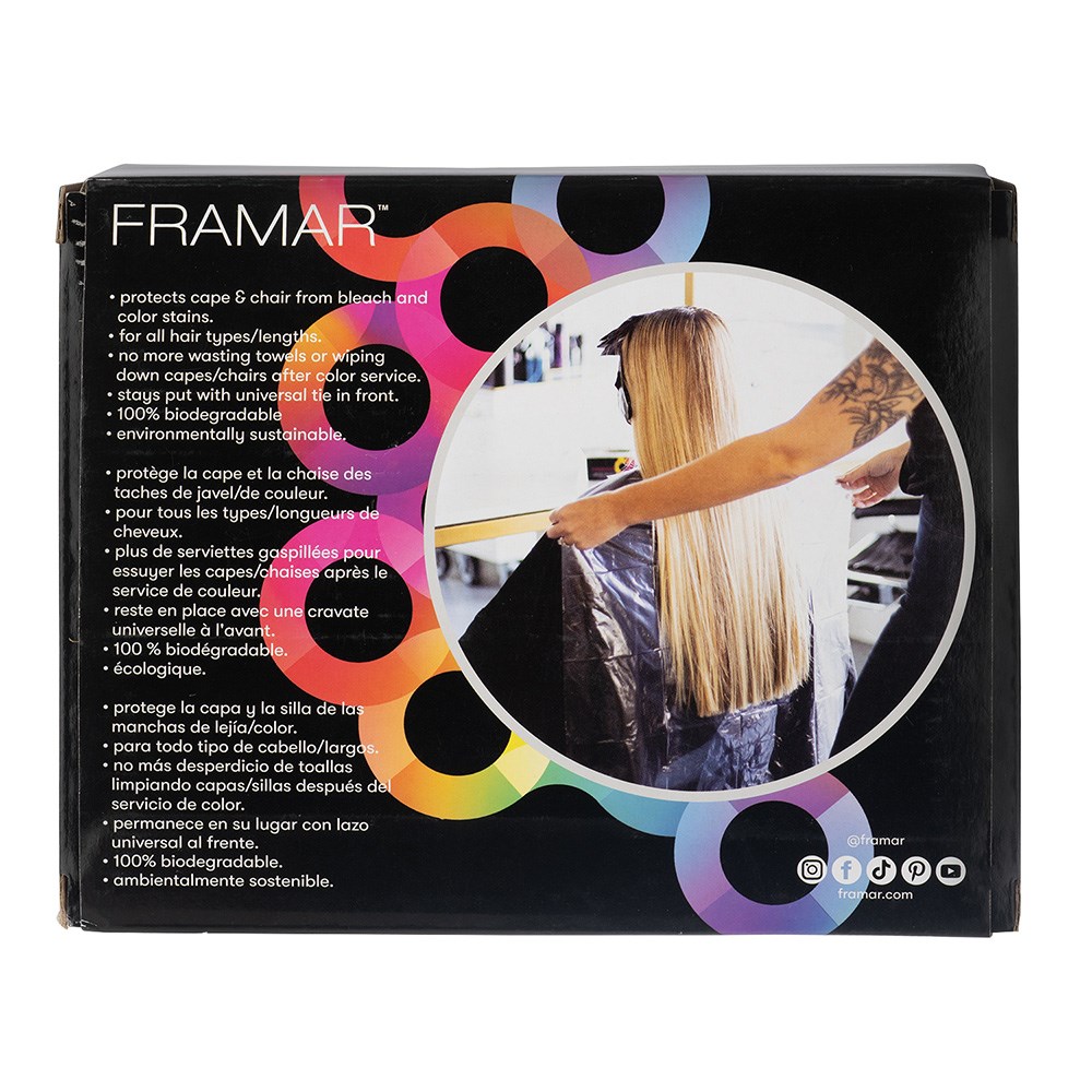 Salon life hack unlocked! Framar Backwards Biodegradable Bibs 50 Pack protects your capes and salon chairs by covered them with easy, biodegradable and disposable covers. Keep your station clean at all times, and your clients, chairs and capes protected. Save the mess; simply tear off and toss in the bin after use. Biodegradable for an eco-friendly choice. 50 bibs per box.