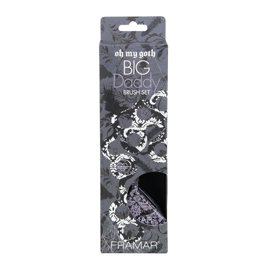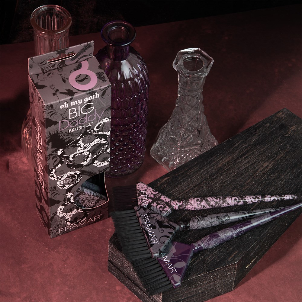 It’s not just a phase! With hauntingly beautiful goth aesthetics, Framar Big Daddy Tint Brush Set Oh My Goth embraces the dark side. Set includes three brushes with Framar’s famous AccuSoft bristles which are tapered to pick up and distribute colour to hair evenly, quickly and precisely. The wide brush head is designed for all over dye jobs and root tapping while still being comfortable in your hand.