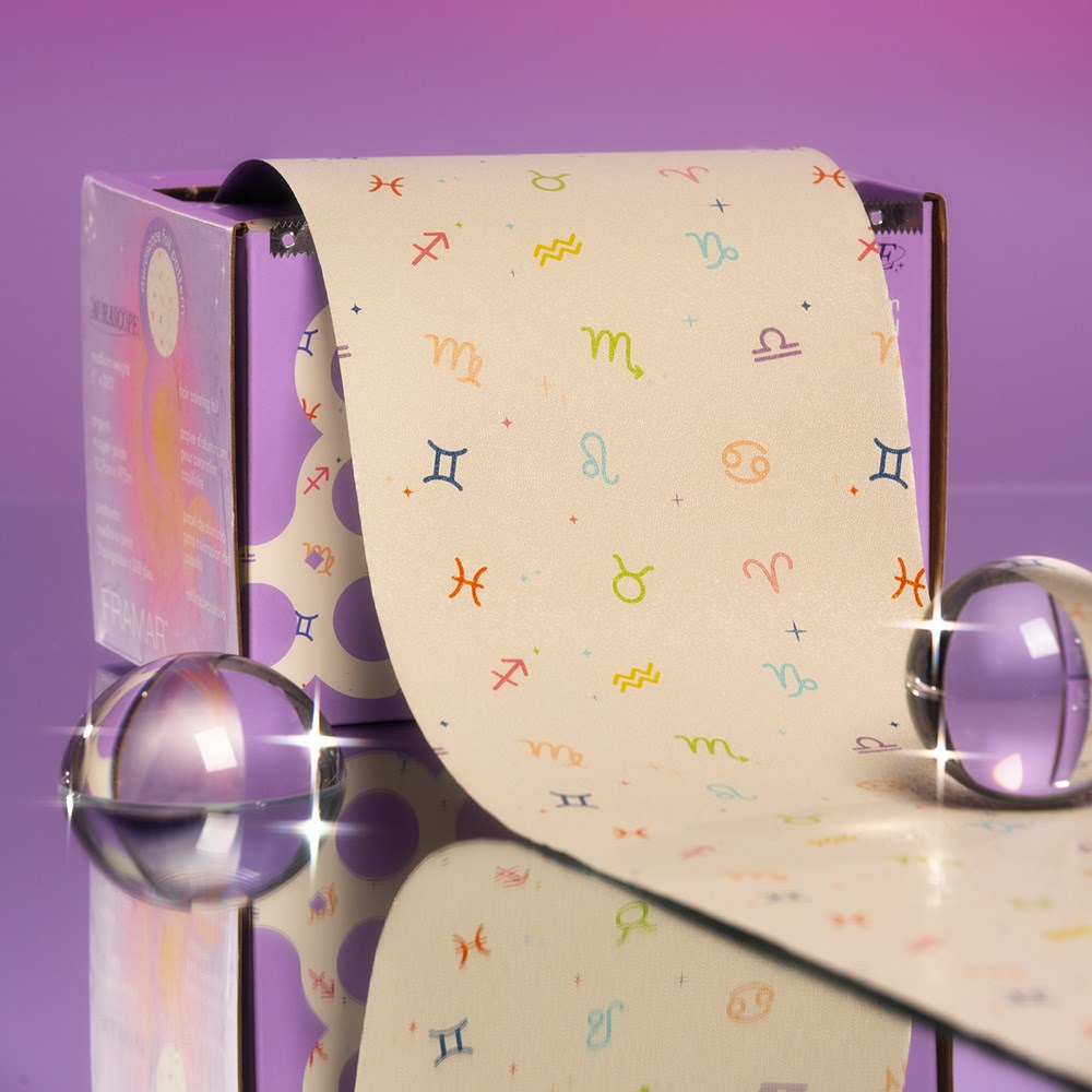It’s written in the stars! Framar Embossed Foil Roll Aurascope is the perfect non-slip grip embossed foil. The embossed texture prevents slippage so you can breeze through any colouring service. High quality foil in horoscope print guaranteed to make every process more fun for you and your client. Rolls out easily with no-hassle cutting. Simply cut to your desired length with the inbuilt cutting blade in the dispenser box. Great for long hair and minimises waste.