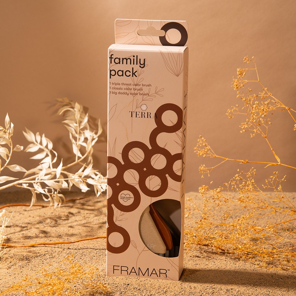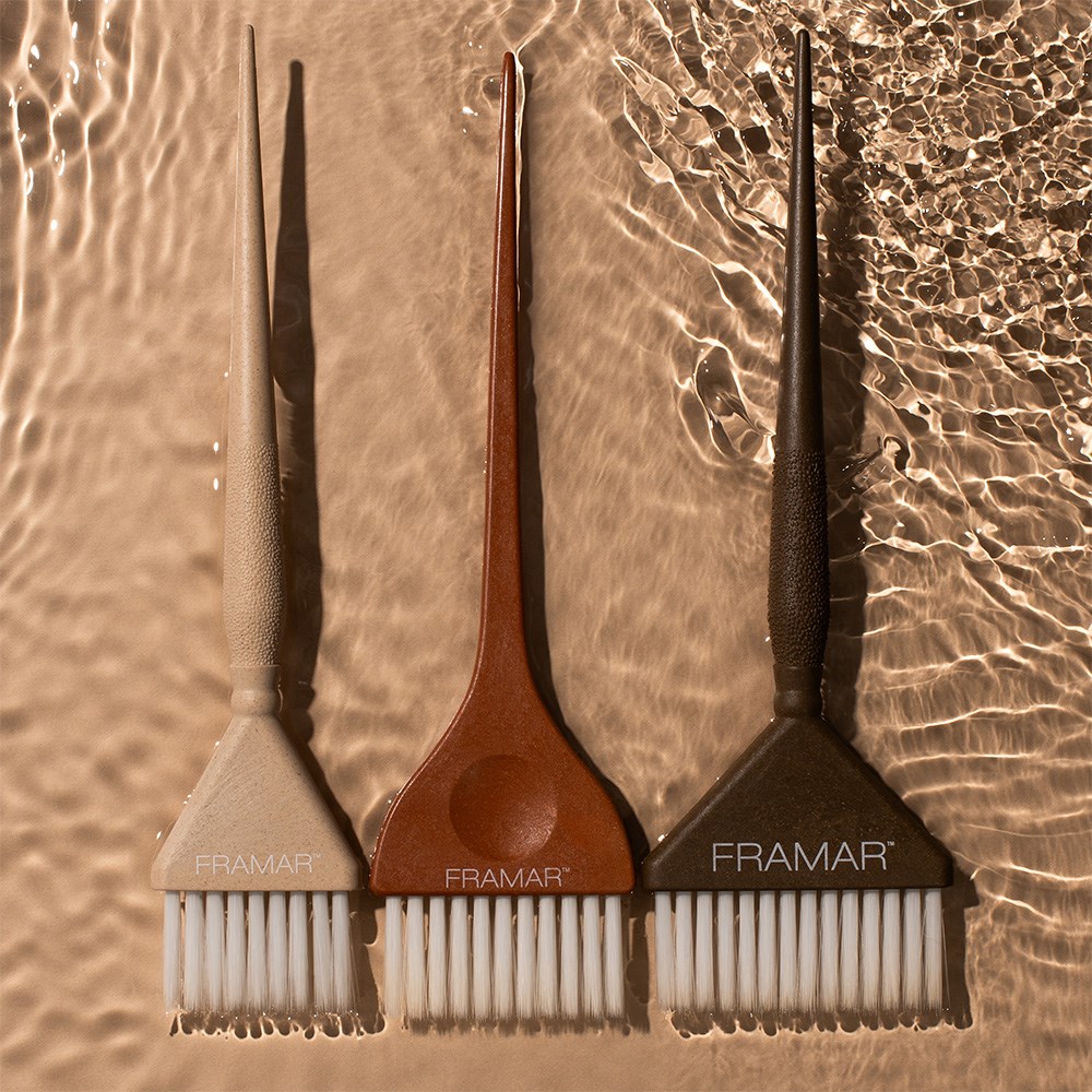 Daydream in neutrals! Framar Family Pack Tint Brush Set Terra Neutrals includes three brushes: Triple Threat Colour Brush, Classic Colour Brush and Big Daddy Colour Brush in earthy tones. All your colouring needs are covered with this versatile set of three very different brushes. Framar’s famous AccuSoft bristles are tapered to pick up and distribute colour to hair evenly, quickly and precisely. Made from eco-friendly wheat fibre.