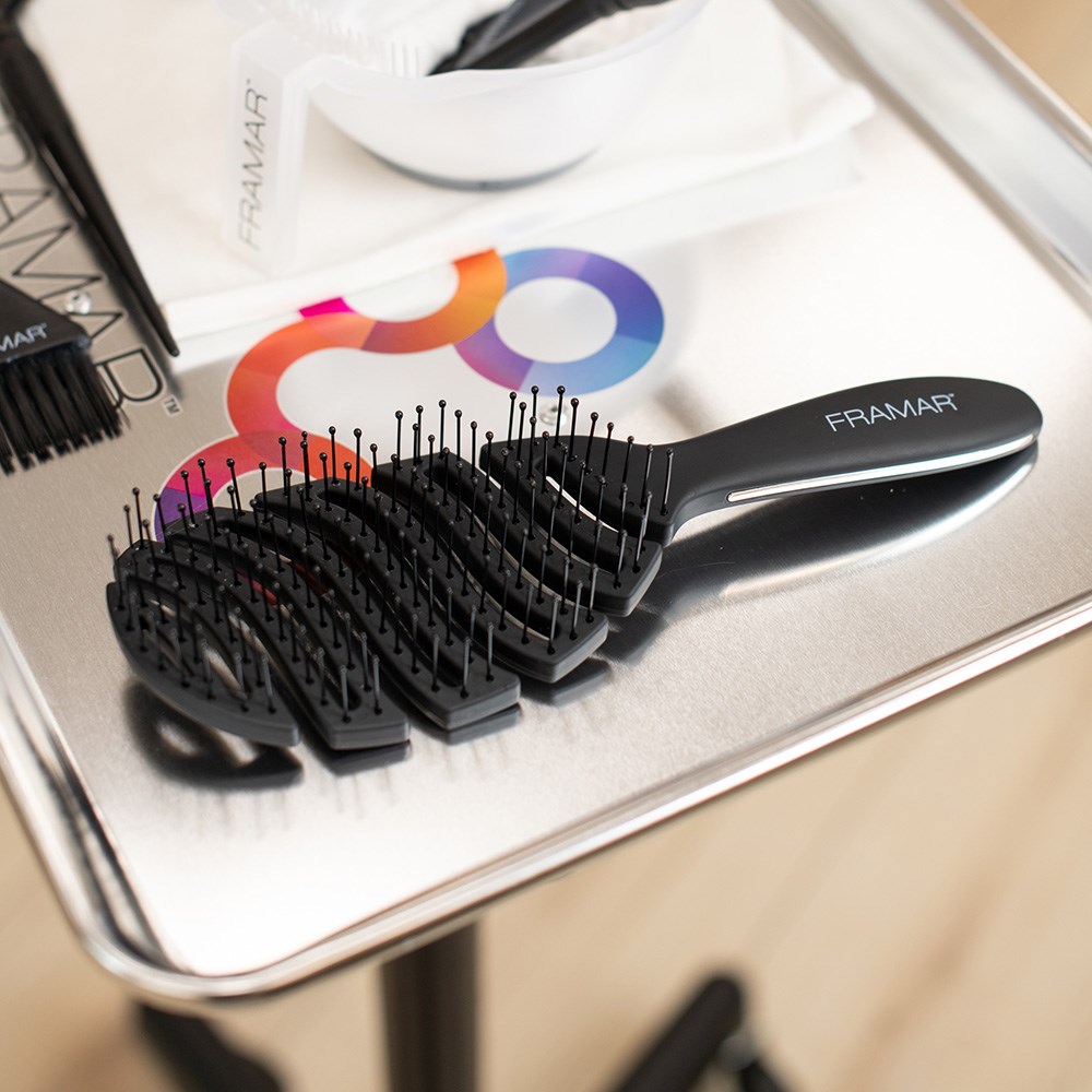 Designed for movement and airflow, Framar Flex Hair Brush Black is heat resistant and perfect for blow-dries. Moving with your scalp, this brush glides through the hair with ease, bending when needed while speeding up drying time. Effortlessly detangles stubborn knots on wet or dry hair. Ideal for all hair types, including wigs and extensions.