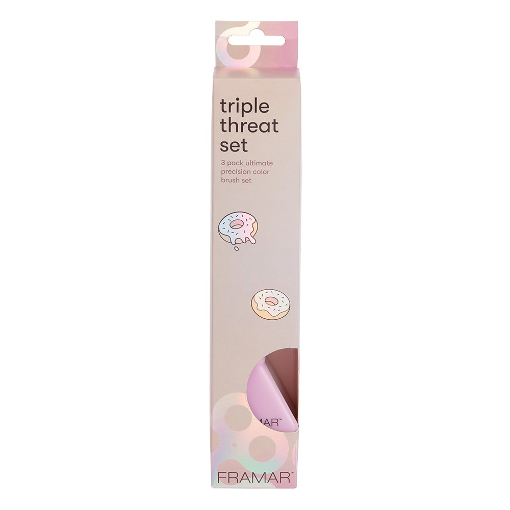 Nice and precise! Framar Triple Threat Tint Brush Set Glazed Donut is a set of brushes which will bring out your true talent. These brushes tackle detail work with ease. Perfect for root tapping, precise blends and babylights. Framar’s famous AccuSoft bristles are tapered to pick up and distribute colour to hair evenly, quickly and precisely. Pink, white and purple colours.