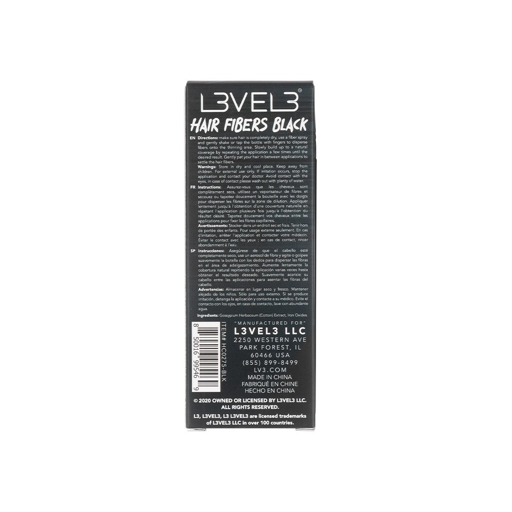 Easy to apply, natural-looking hair fibres which give the appearance of thicker hair. L3VEL3 Hair Fibres Black let you fake it till you make it. These hair fibres instantly fill in the blanks, whether from an area of patchy growth, receding hairline or balding spot. An innovative hair fibre applicator (sold separately) ensures application is a breeze and the fibres blend effortlessly. Made from cotton extract. Great for men and women, simply use any time you desire the illusion of thicker, more even hair and disguised greys.