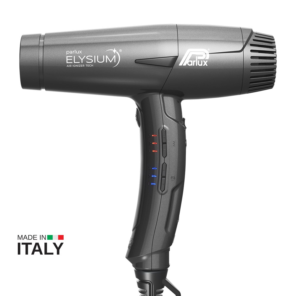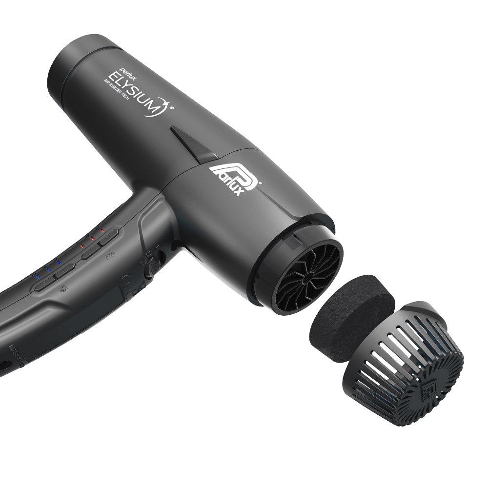 The first Parlux digital mini hair dryer. Designed to meet the needs of professionals, Parlux Elysium Hair Dryer is a futuristic experience. Delivering outstanding reliability, Parlux Elysium Hair Dryer is small, light and powerful. Professional digital oversized mini-motor with a powerful 2,300 watts and 80m3/h airflow. 3 speed and 3 temperature settings for 9 versatile combinations. Air Ionizer Tech ionic technology for smoother, sleeker results. Lightweight and perfectly balanced with an ergonomic handle. Quick and easy cleaning with washable and replaceable sponge filter. Includes 3 concentrator nozzles, 2 of which are new AirFusion nozzles to optimise airflow for faster, more precise styling with enhanced shine. Made in Italy.