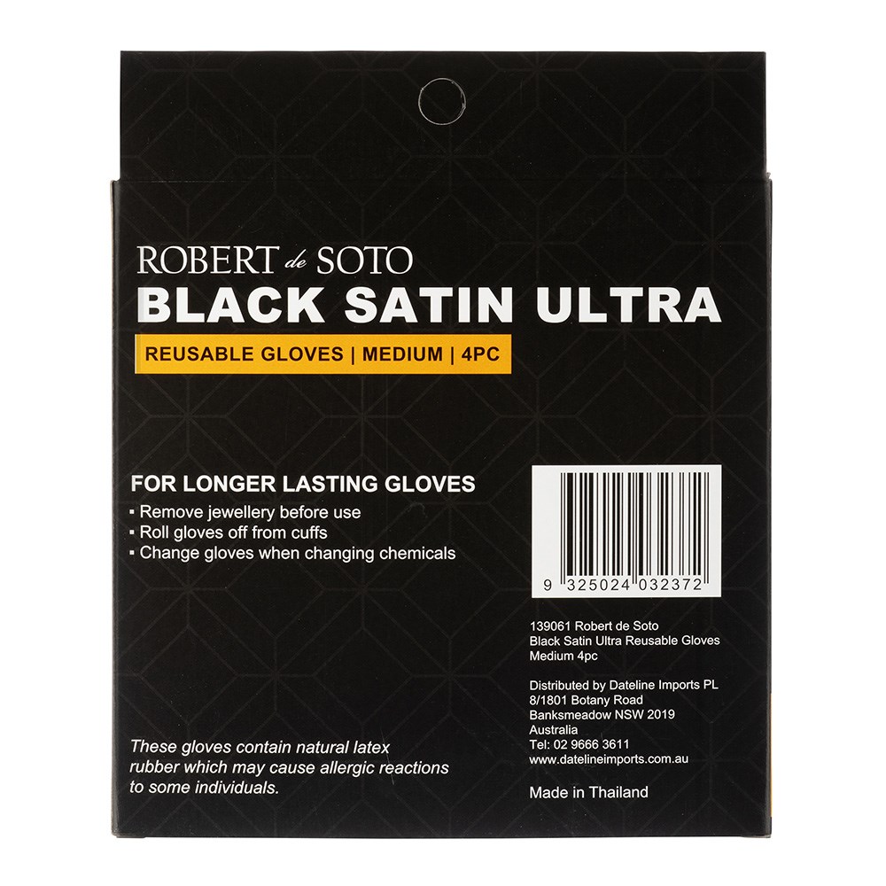 Carefree and stain-free! Easy on and easy off, Robert de Soto Black Satin Reusable Gloves are made from powder-free natural latex to protect your hands from colour stains. These comfortable, reusable gloves won’t pull or stick to the hair, and are resistant to nail punctures. Designed to fit either hand, these washable gloves are available in a pack of 4. Size: Medium.
