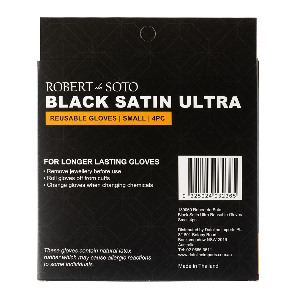 Carefree and stain-free! Easy on and easy off, Robert de Soto Black Satin Reusable Gloves are made from powder-free natural latex to protect your hands from colour stains. These comfortable, reusable gloves won’t pull or stick to the hair, and are resistant to nail punctures. Designed to fit either hand, these washable gloves are available in a pack of 4. Size: Small.