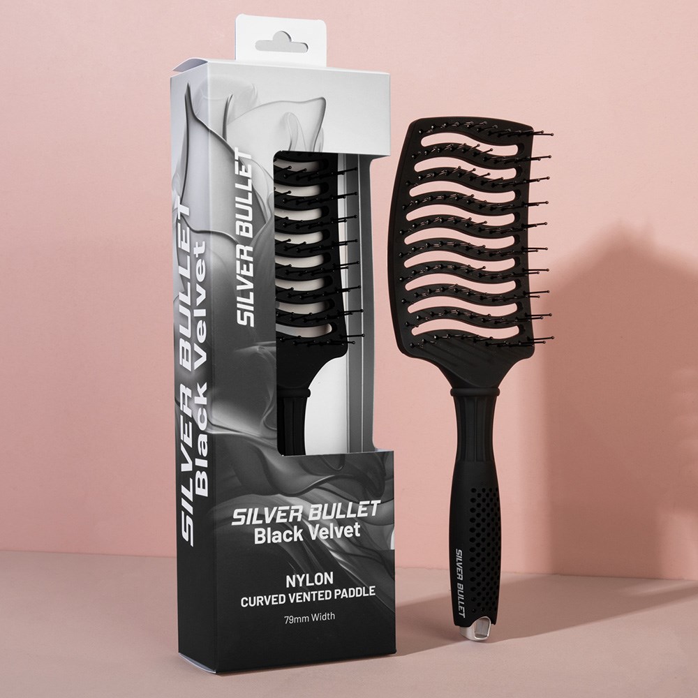 Create hair as smooth and soft as velvet. The Silver Bullet Black Velvet Curved Vent Paddle Hair Brush is ideal for detangling, smoothing, and drying. Its vented design speeds up blow drying for enhanced efficiency, while the curved head contours to the scalp for superior comfort. Featuring durable nylon bristles, this brush delivers luxurious results with ease.