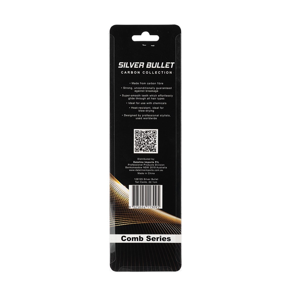 Silver Bullet Carbon. Strong. Resistant. Super-smooth. Silver Bullet Carbon Metal Tail Comb is made from carbon fibre and unconditionally guaranteed against breakage. Super-smooth teeth effortlessly glide through all hair types. Heat resistant. Ideal for use with chemicals. This 22.1cm comb is best suited to precision styling, parting and sectioning hair. The metal pin tail is durable and long-lasting. Use during foiling and highlighting or for creating updos and braiding.