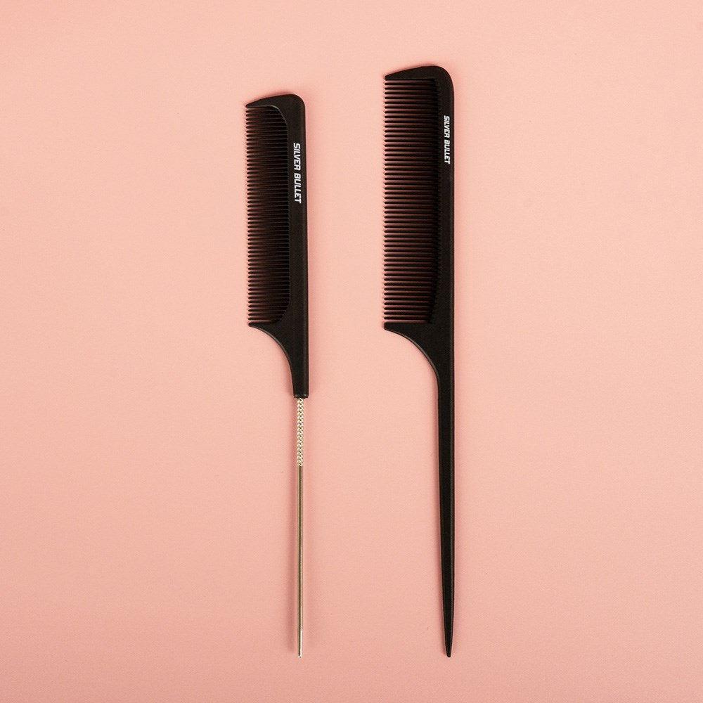 Silver Bullet Carbon. Strong. Resistant. Super-smooth. Silver Bullet Carbon Tail Comb is made from carbon fibre and unconditionally guaranteed against breakage. Super-smooth teeth effortlessly glide through all hair types. Heat resistant and perfect for blow-drying. Ideal for use with chemicals. This 23.8cm comb is excellent for parting and sectioning during blow-drying, curling and straightening. Plastic pin tail provides gentler sectioning without scratching the scalp.