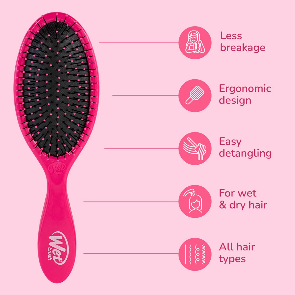 Meet the WetBrush Original Detangler Hair Brush Pink. World famous exclusive IntelliFlex bristles loosen knots and tangles on wet or dry hair, without pulling or snagging. Letting you brush with less force resulting in less damage. The moment you use a Wet Brush Detangler, you’ll never want to try another detangling hair brush again.