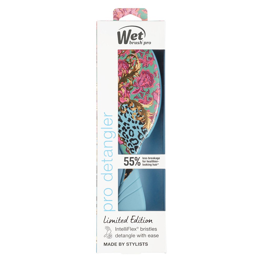 Adventure in full bloom! WetBrush Pro Floral Safari Detangler Blue features a limited edition floral animal print. This is the world famous, award-winning Wet Brush Original Detangler redesigned by stylists for stylists. Revolutionary IntelliFlex bristles diffuse knots on all hair types, wet or dry, gliding through tangles with less effort, less pain and over 55%* less breakage. Ergonomically advanced with finger rests and rubberised EasyGrip handle for more comfort and control.