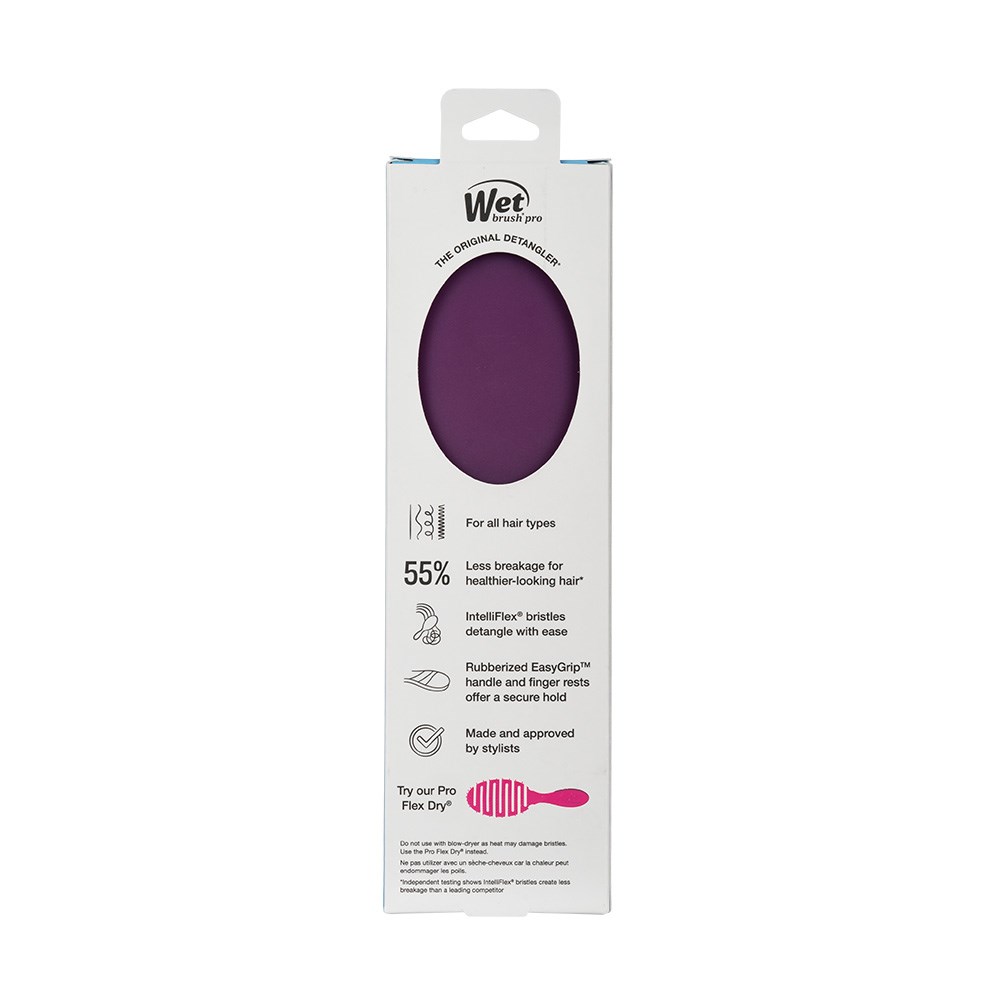 Brush boldly! WetBrush Pro Frost Detangler Purple features limited edition bold colour. This is the world famous, award-winning Original Detangler redesigned by stylists for stylists. Revolutionary IntelliFlex bristles diffuse knots on all hair types, wet or dry, gliding through tangles with less effort, less pain and over 45% less breakage**. Ergonomically advanced with finger rests and rubberised EasyGrip handle for more comfort and control.