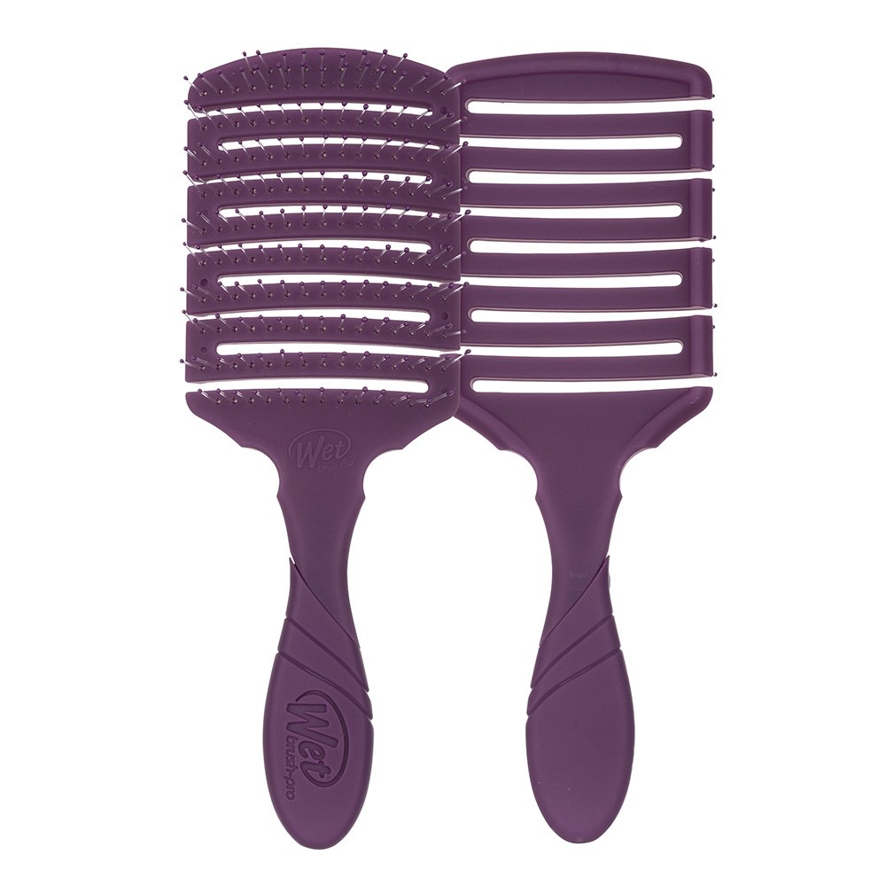 Stylists’ fave way to faster hair drying. WetBrush Pro Frost Flex Dry Paddle Detangler Purple features a flexible vented paddle design to speed up dry time while contouring to the scalp for comfort. HeatFlex bristles are heat resistant and safe to use with a blow-dryer. OmniFlex brush head flexes in every direction to contour to scalp. This hair brush has a 20% larger surface area for faster styling.