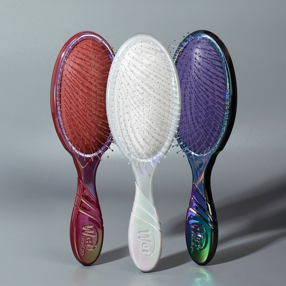 Otherworldly brushing! WetBrush Pro Holographic Detangler Silver features a limited edition holographic design. This is the world famous, award-winning Wet Brush Original Detangler redesigned by stylists for stylists. Revolutionary IntelliFlex bristles diffuse knots on all hair types, wet or dry, gliding through tangles with less effort, less pain and over 55% less breakage for healthier-looking hair*. Ergonomically advanced with finger rests and rubberised EasyGrip handle for more comfort and control.