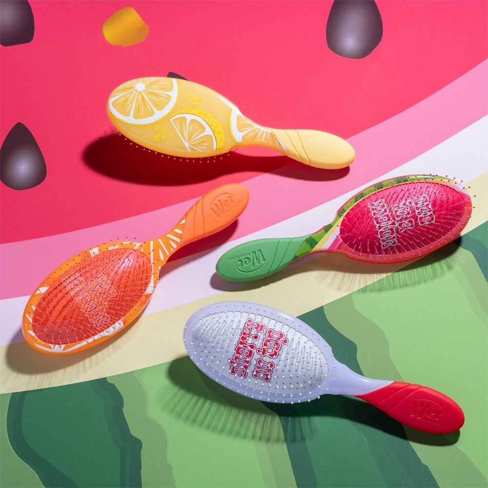 The vibrant spirit of summer! WetBrush Pro Tutti Fruitti Detangler Orange features a limited edition fruit design. This is the world famous, award-winning Original Detangler redesigned by stylists for stylists. Revolutionary IntelliFlex bristles diffuse knots on all hair types, wet or dry, gliding through tangles with less effort, less pain and over 55%* less breakage. Ergonomically advanced with finger rests and rubberised EasyGrip handle for more comfort and control.
