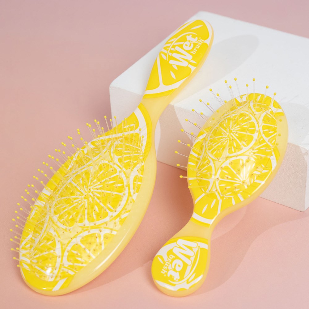 Sweetly detangle with this adorable on-the-go brush! WetBrush Tutti Fruitti Mini Detangler Lemon helps hair stay strong and healthy-looking. Gently loosen knots on wet or dry hair, without pulling or snagging. Exclusive, ultra-soft IntelliFlex bristles glide through tangles on all hair types with ease. The moment you use it, you’ll feel the Wet Brush difference and never want to try another hairbrush again. Kids love it too! Limited edition in Lemon.
