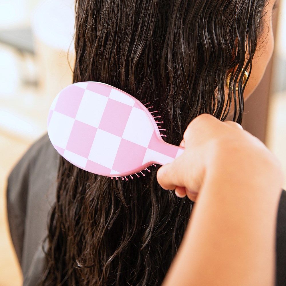 Tame your tresses in style! Framar Detangle Hair Brush Checked Out Pink is a bold blend of playful design and serious detangling power. This brush effortlessly detangles wet or dry hair with ease. Ideal for all hair types, including wigs and hair extensions. Flexible bristles deliver pain-free brushing. Not only a detangler, this brush is also great at brushing colour or toner through hair for even application or assist in styling, such as brushing out curls.