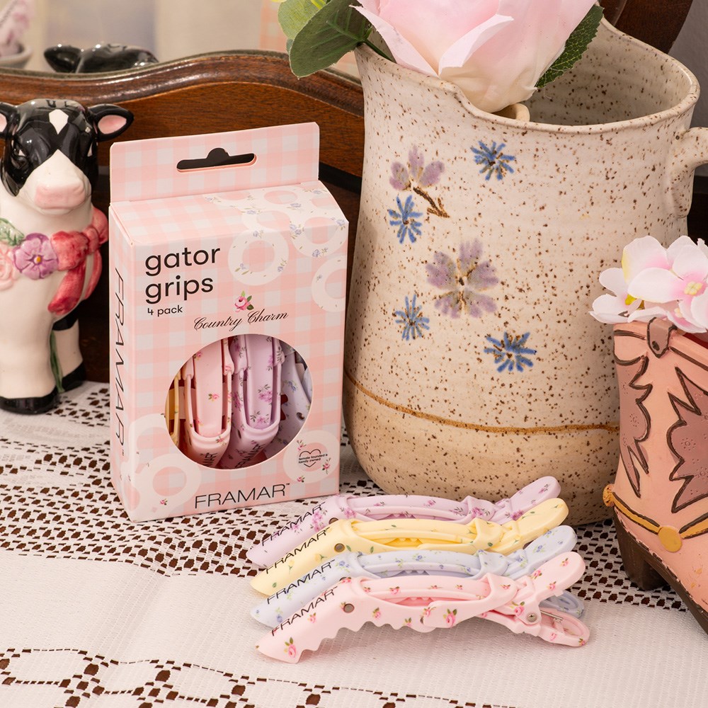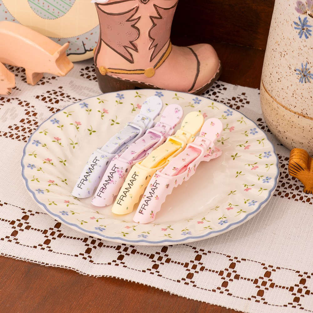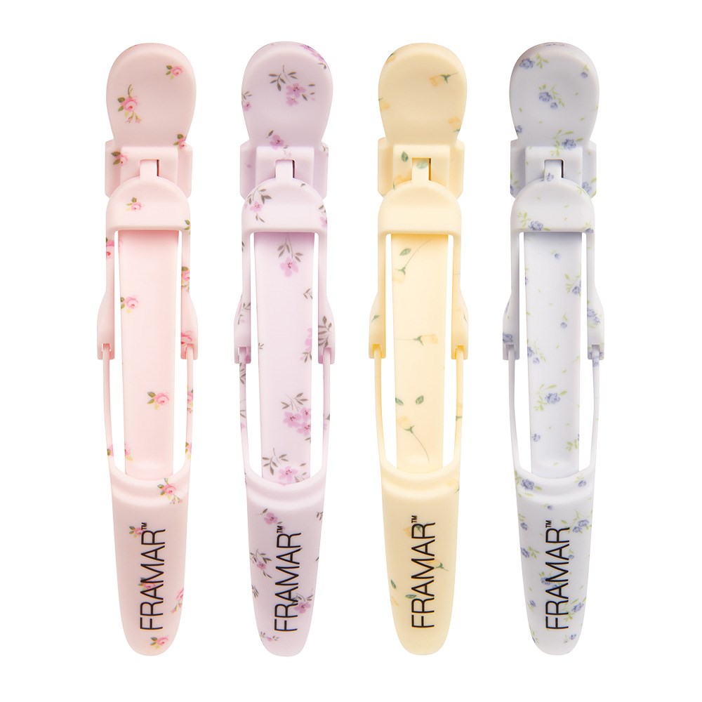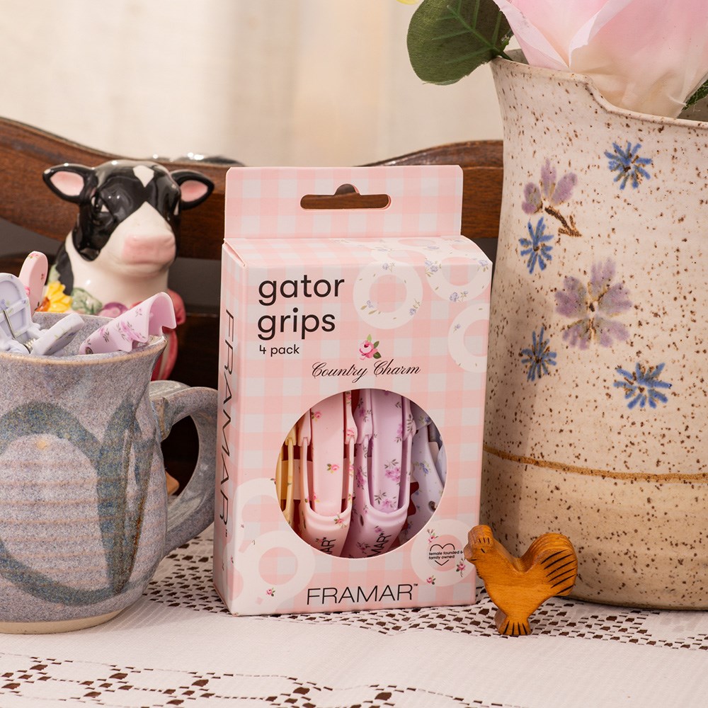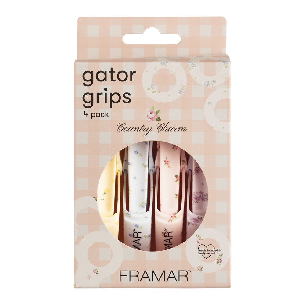 A touch of countryside charm! Framar Gator Grip Clips 4 Pack Country Charm effortlessly holds large sections of hair. With a wide mouth and rubberised non-slip surface, these clips are stronger than an alligator. Secures hair during colouring, styling and foiling. Industrial springs for ultimate durability. Country Charm embodies vintage charm inspired by flower fields. Pack of four.