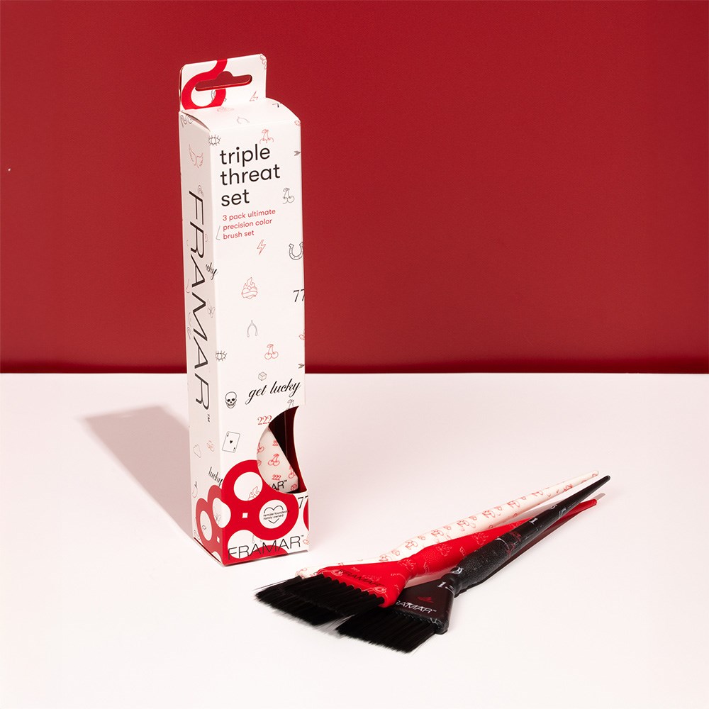 You just found your lucky charms! Framar Triple Threat Tint Brush Set in Get Lucky is a set of brushes which will bring out your true talent. These brushes tackle detail work with ease. Perfect for root tapping, precise blends and babylights. Framar’s famous AccuSoft bristles are tapered to pick up and distribute colour to hair evenly, quickly and precisely. Lucky charm print in red, black and white.