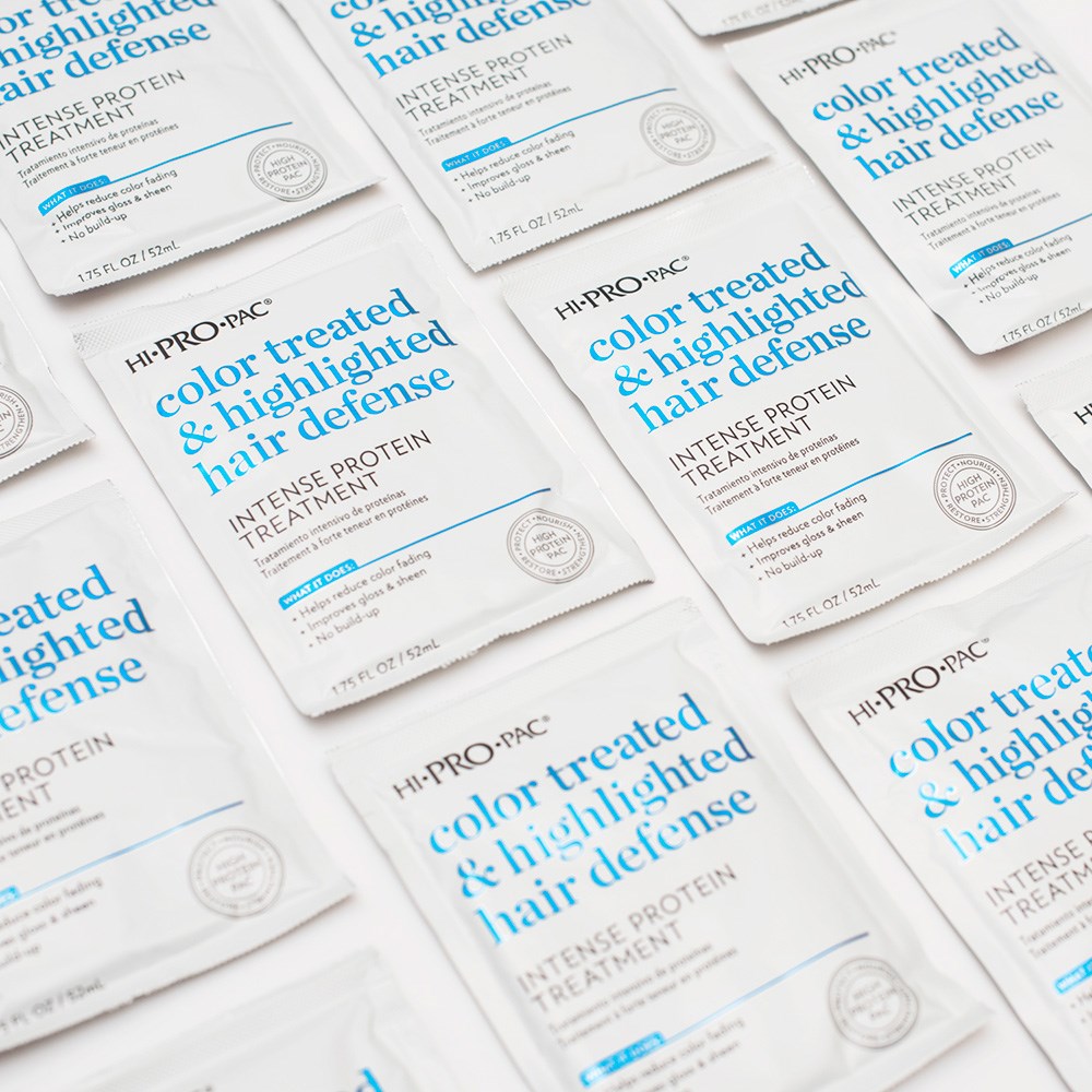 Hi Pro Pac Colour Treated and Highlighted Intense Protein Treatment gently conditions with a pH balanced formula to reduce colour fading with no build up. A professional salon treatment to recondition hair damaged by colour or highlighting. This formula is specially adapted to combat problems that occur during the colour process.