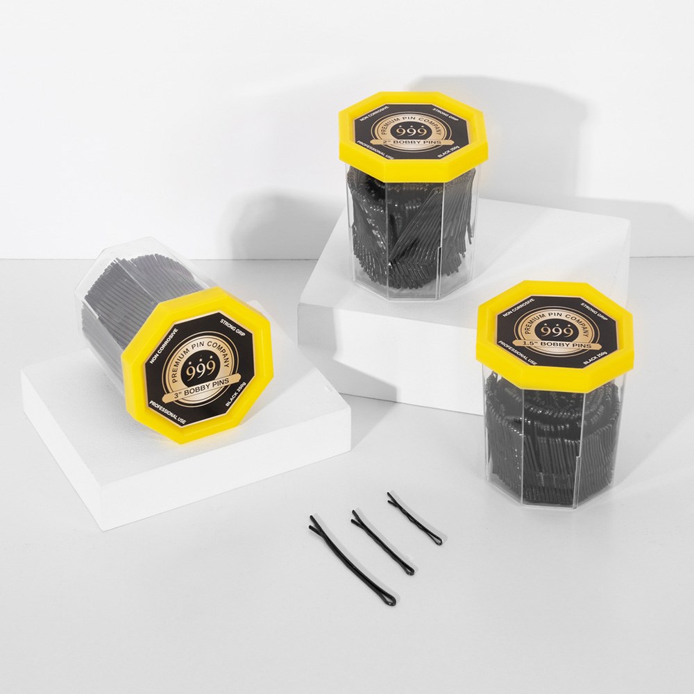 Premium Pin Company 999 Bobby Pins 1.5” Black 250g are expertly designed to meet the demands of hairdressing professionals and enthusiasts alike. With an extra-strength design, they securely hold your hairstyle or updo in place, ensuring a flawless look that lasts. The long-lasting spring, firm secure grip, durable tips, and rust-resistant materials make these bobby pins a reliable choice for your hairstyling needs. Convenience is key, which is why our bobby pins are housed in an easy-to-use see-through dispenser. No more fumbling through drawers struggling to find the right pin. Our dispenser keeps your pins organised and within reach, making hairstyling effortless. Choose Premium Pin Company 999 for superior quality and performance.