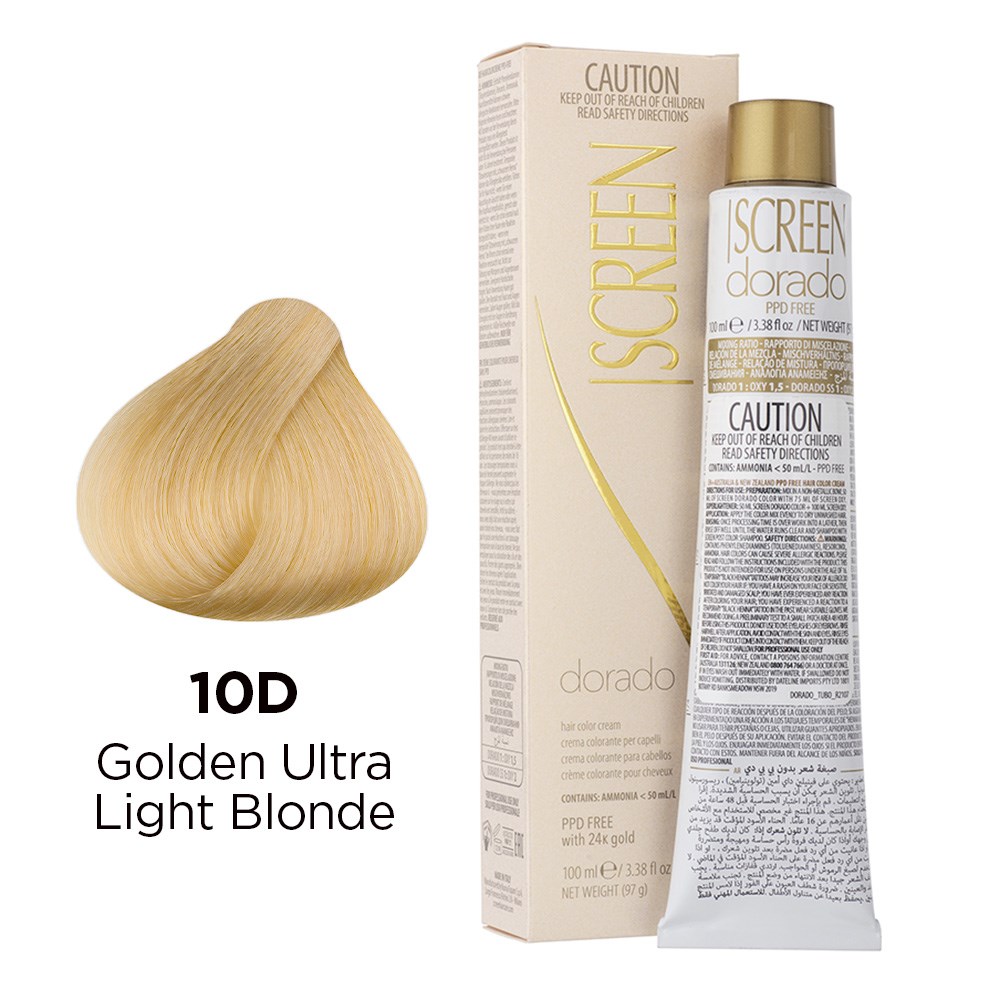 Precious cream colour with unique tonal richness. Developed in a wide range of colours, Screen Dorado Hair Colour Cream 10D Golden Ultra Light Blonde is the culmination of advanced technology, research and continuous testing. This hair colouring cream is PPD-free and enriched with 24K gold for results which are truly incredible. Microparticles of gold reflect light, multiplying the brilliance of colour. Colour is intensely rich and exceptionally long-lasting. Maximum grey coverage and balanced, uniform results. Elite colour created in Italy.