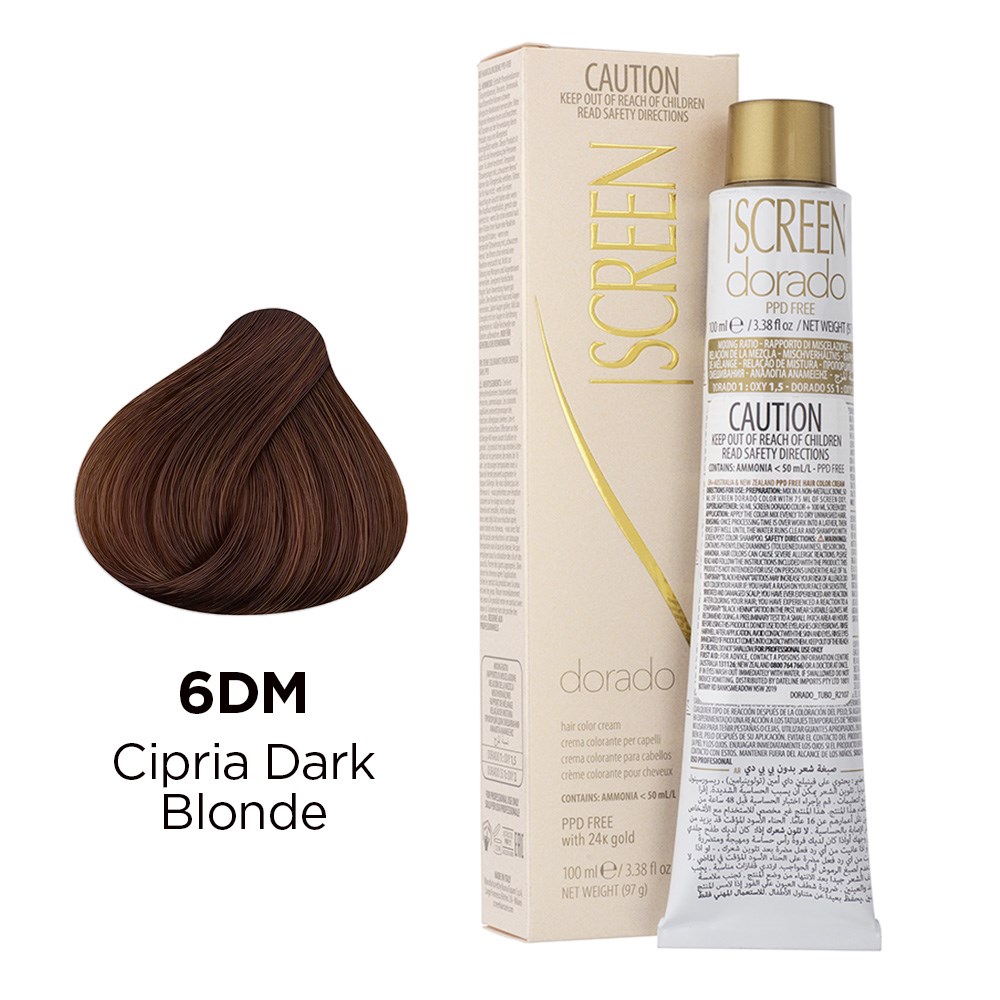 Precious cream colour with unique tonal richness. Developed in a wide range of colours, Screen Dorado Hair Colour Cream 6DM Cipria Dark Blonde is the culmination of advanced technology, research and continuous testing. This hair colouring cream is PPD-free and enriched with 24K gold for results which are truly incredible. Microparticles of gold reflect light, multiplying the brilliance of colour. Colour is intensely rich and exceptionally long-lasting. Maximum grey coverage and balanced, uniform results. Elite colour created in Italy.