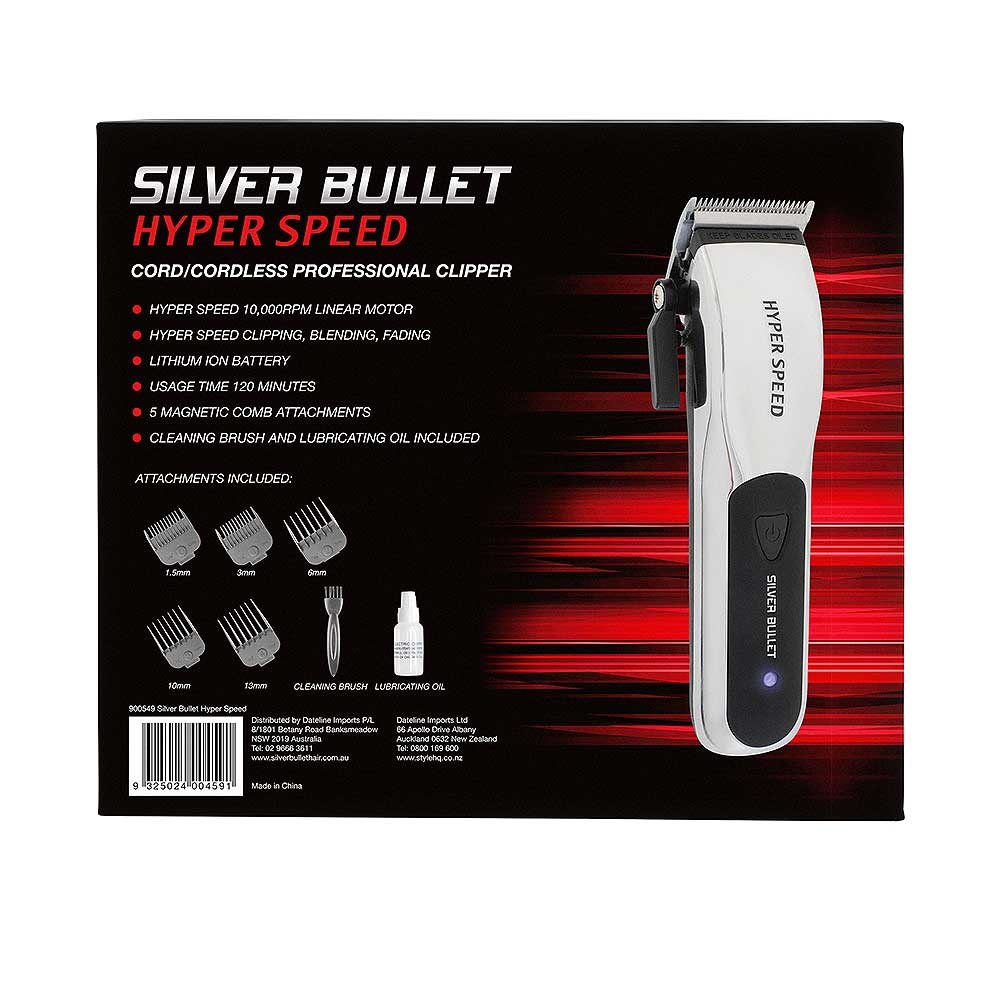 Brace yourself for ultra-close, hyper speed performance. Silver Bullet Hyper Speed Hair Clipper represents speed to the max with a powerful, professional hair clippers with a 10,000 rpm linear motor. Ultra-close, efficient and smooth clipping, blending and fading. Powerful, long-life lithium battery delivers 120 minutes of convenient cordless usage time. Magnetic comb attachments simply click into place for seamless transition. Clipping without compromise.