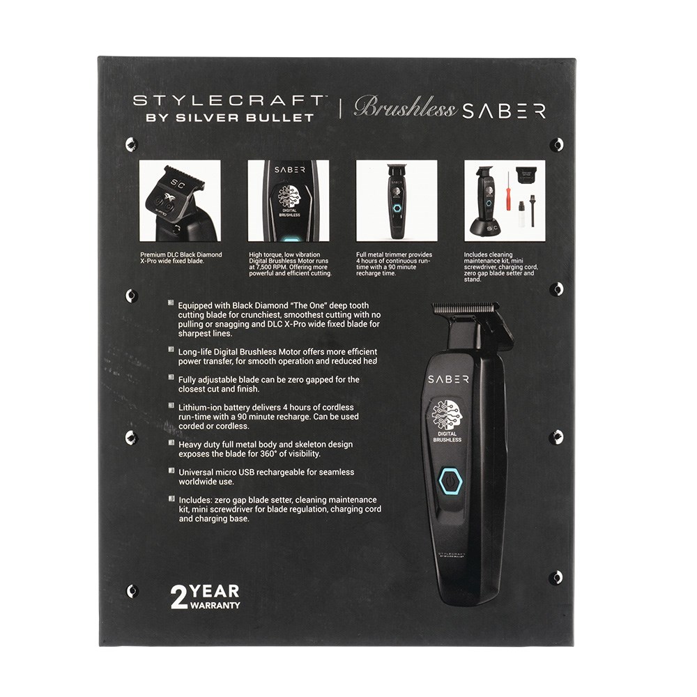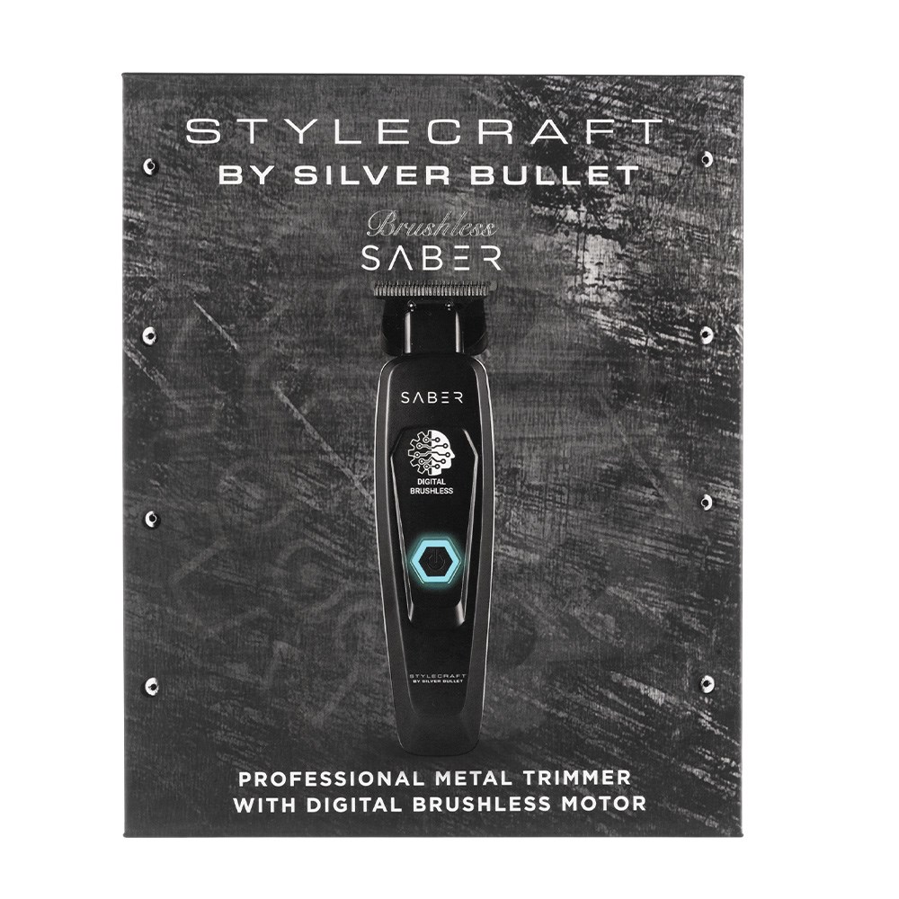 StyleCraft by Silver Bullet Saber Digital Brushless Hair Trimmer Black is a hero trimmer for agility, efficiency and smoothness. Long-life digital brushless motor runs at 7,500 rpm for more efficient power transfer, ensuring smooth operation and heat reduction. Heavy duty, all-metal body with slim design. Black diamond carbon DLC X-Pro wide fixed blade and The One deep tooth moving blade are an unbeatable combo. Fully adjustable zero gap for the closest cut and finish. Skeleton design exposes the blade for superior sightline and improved precision. Lithium-ion battery delivers four hours of cordless runtime with a 90 minute recharge. Universal USB rechargeable.