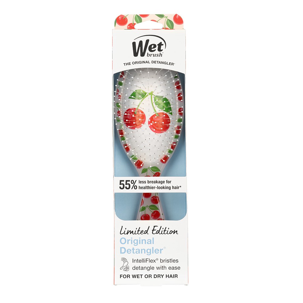 The original, award-winning brush which helps hair stay strong! WetBrush Tutti Fruitti Detangler Cherry gently loosens knots on wet or dry hair without pulling or snagging. The moment you use it, you’ll feel the difference and never want to try another detangling brush again. Exclusive, ultra-soft IntelliFlex bristles glide through tangles on all hair types with ease. Minimise pain and protect against split ends and breakage. Brush with less force so you can detangle with less damage to hair. We’re sweet on this limited edition WetBrush Detangler in Cherry!